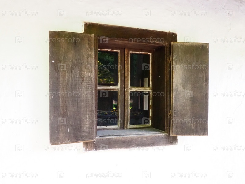 Старые деревянные ставни открыты. Деревянные оконные рамы и ставни. Копирование пространства. Белая бетонная стена. Традиционная деревенская архитектура. Домашний крестьянский быт. Юго-Восточная Европа, Сербия