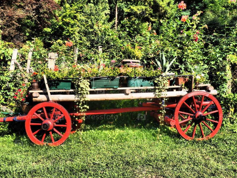 Старая карета или телега. Летний день. Традиционная сельская повозка, запряженная лошадьми. Колесница красная с цветами. Конная повозка. Ретро деревянное колесо. Украшение сада и газона