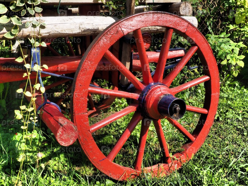 Старая карета или телега. Летний день. Традиционная сельская повозка, запряженная лошадьми. Колесница красная с цветами. Конная повозка. Ретро деревянное колесо. Украшение сада и газона
