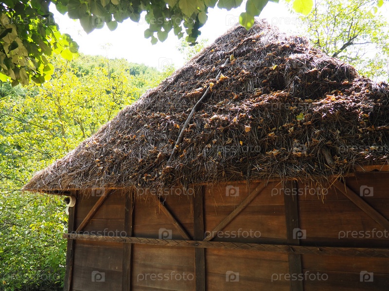 Традиционный загородный дом или сарай с соломенной, сухой травянистой крышей летом в лесу. Поделка крыши из сухой растительности и веток. Этнотуризм. Хозяйственное здание, Лозница, Сербия