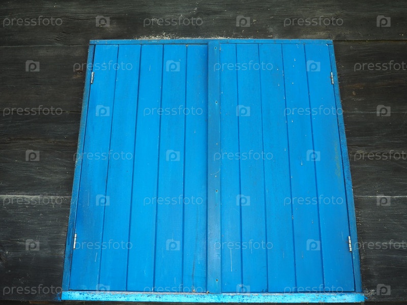 Деревянные синие закрытые ставни на окне старого традиционного деревенского дома Ставяны. Старый этно-сельский стиль. Текстура дерева. Плотницкое ремесло
