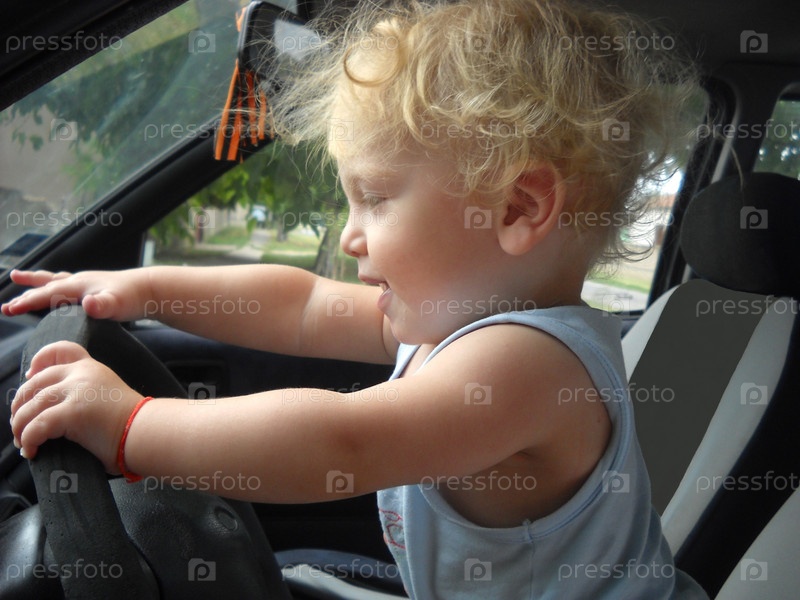 Годовалый мальчик с пышными светлыми волосами в летней футболке сидит в машине на водительском месте и делает вид, что он водитель машины