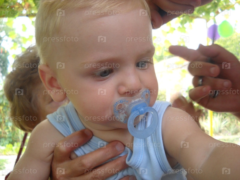Крупным планом голова ребенка белой расы с голубыми глазами с соской во рту. Волосы ребенка подстрижены ножницами. Видны руки парикмахера и бабушки. На открытом воздухе, лето
