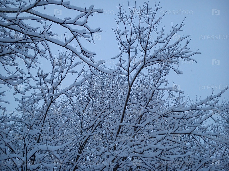 Зимний лесной пейзаж после долгого снегопада. Тихая, спокойная погода во второй половине дня. Ветви деревьев согнуты под тяжестью снега