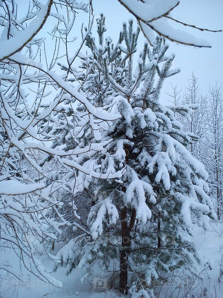 Короткий зимний северный день. Мягкая, спокойная погода с большим количеством осадков в виде снега. Сосновые ветки практически не выдерживают тяжелых навалов снега. Молодая сосна в лесу