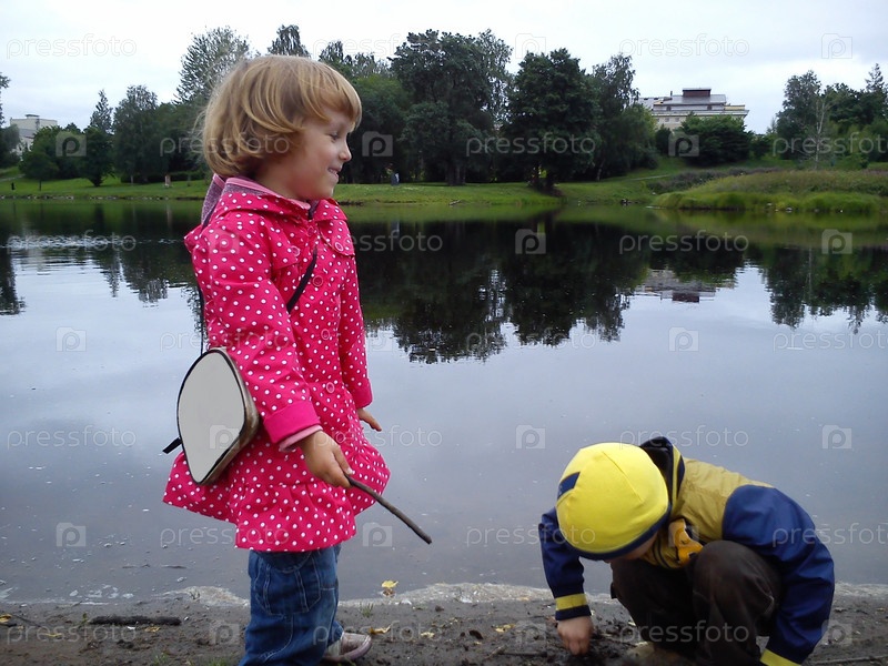 Брат и сестра гуляют возле реки. Мальчик и девочка одеты в джинсы и осеннюю одежду. В начале лета. Разговаривайте и играйте у воды. Розовый плащ в белый горошек, желтая куртка