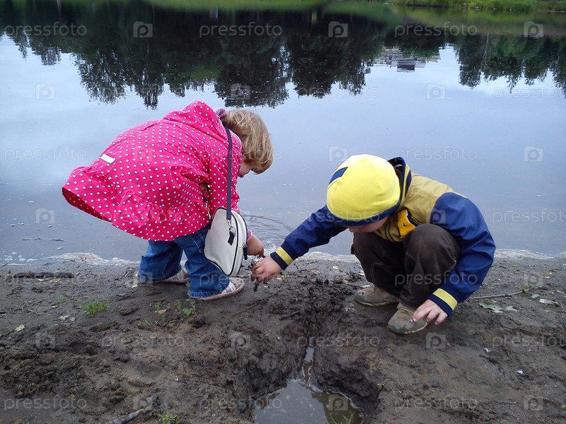 Брат и сестра гуляют возле реки. Мальчик и девочка одеты в джинсы и осеннюю одежду. В начале лета. Разговаривайте и играйте у воды. Розовый плащ в белый горошек, желтая куртка