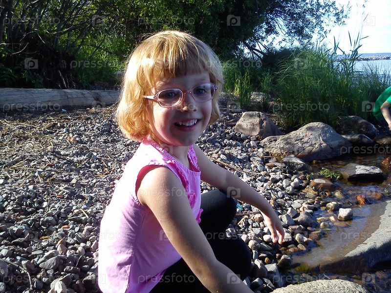 Маленькая девочка со светлыми волосами сидит летом на озере и улыбается. Очки в розовой оправе. У ребенка астигматизм. Ребенок одет в розовую блузку с жабо. Скалистый берег
