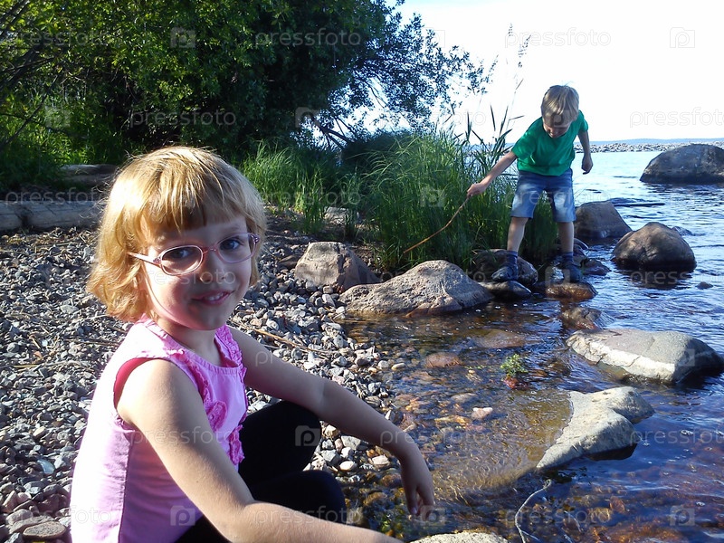 Маленькая девочка со светлыми волосами сидит летом на озере и улыбается. Очки в розовой оправе. У ребенка астигматизм. Ребенок одет в розовую блузку с жабо. Мальчик на заднем плане