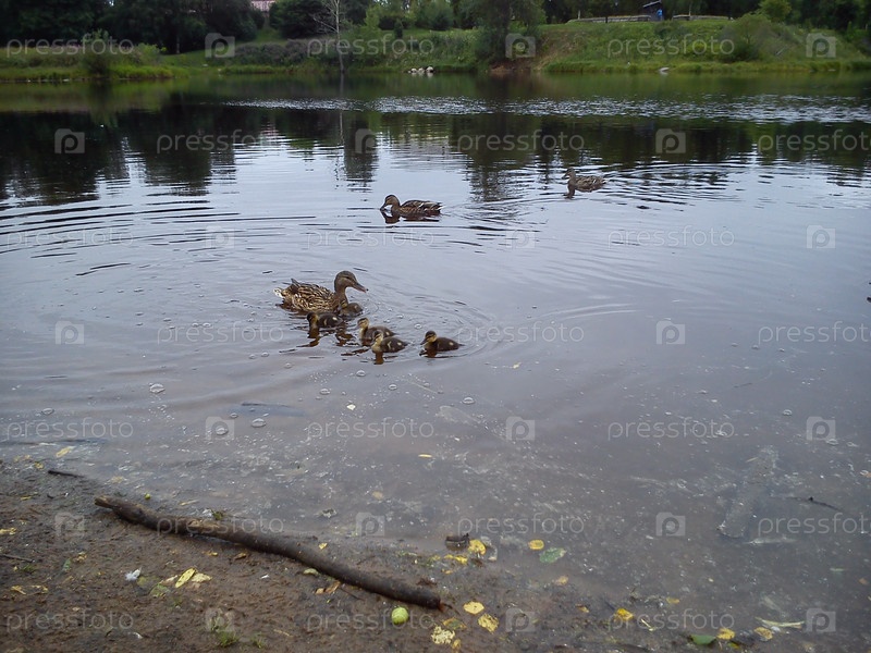 Ранним летом по реке плавает семейство уток. Утка — самка и несколько утят в воде
