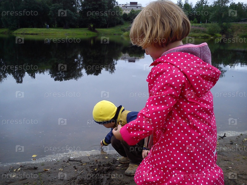Брат и сестра гуляют возле реки. Мальчик и девочка одеты в джинсы и осеннюю одежду. В начале лета. Разговаривайте и играйте у воды. Розовый плащ в белый горошек, желтая куртка
