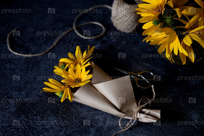 Букет желтых цветов на темном фоне в стиле гранж, абстрактная цветочная композиция, день матери, свадебный подарок, весенний или осенний фон с местом для текста, минималистичная концепция праздника, сдержанный натюрморт,