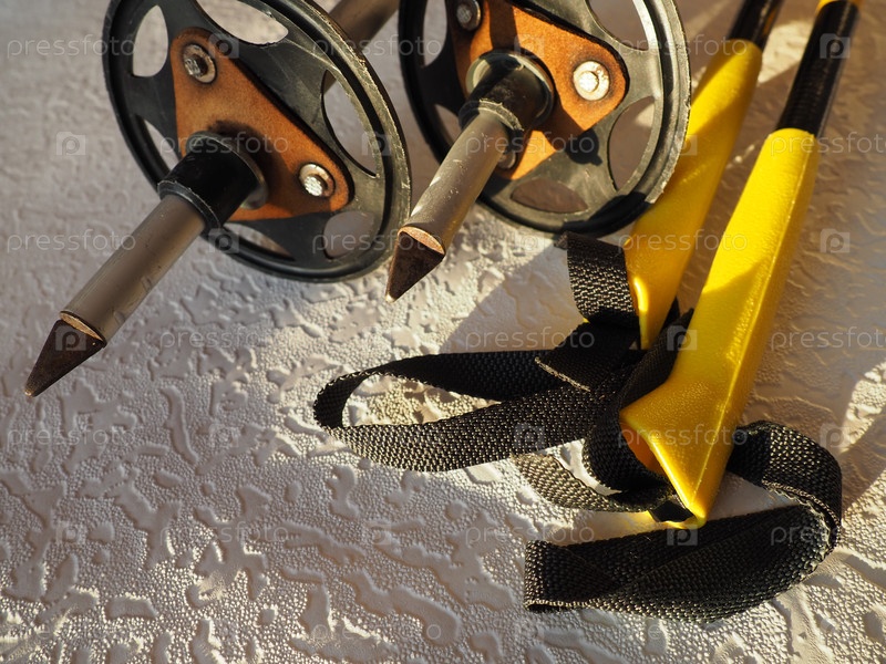Поляки. Спортивный инвентарь, используемый лыжниками, альпинистами, туристами для сохранения равновесия и ускорения движения во время катания на лыжах. Круглые кольца с кожаными вставками для предотвращения падения клюшки в снег