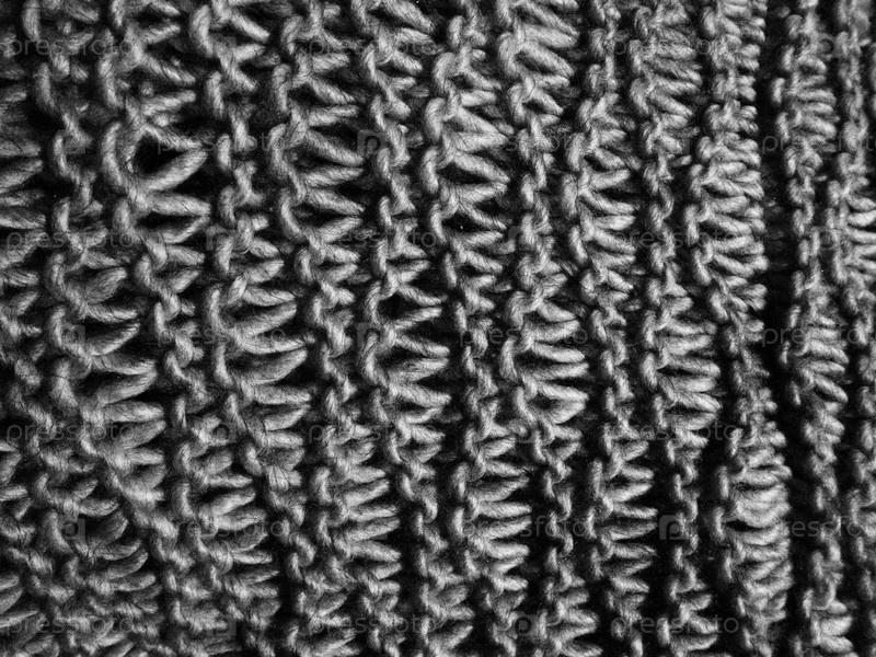 Вязаный узор из шерстяной или акриловой пряжи. Пышная машинная или ручная вязка. Теплый гардероб на осенне-зимний период. Способ вязания – волнистая резинка. Черно-белое монохромное изображение