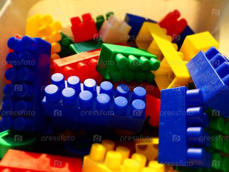 Разноцветный пластиковый конструктор. Синие, красные, желтые, зеленые строительные элементы. Игрушка, развивающая творческие способности и мелкую моторику