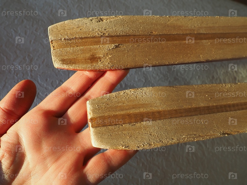 Рука касается лыж. Деревянные лыжи, одна пара. Вырез в нижней части