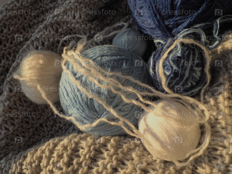 Натюрморт из клубков, шерстяных и акриловых ниток, спиц, трикотажных изделий. Мягкий свет из окна. Вязание как хобби. Производство модной теплой одежды