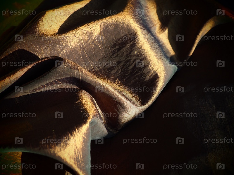 Красивая ткань - тафта, аккуратно сложенная волнами. Мятый материал, похожий на шелк или парчу. Перелив и цветовой градиент при разных углах освещения. Ткань для пошива одежды и штор