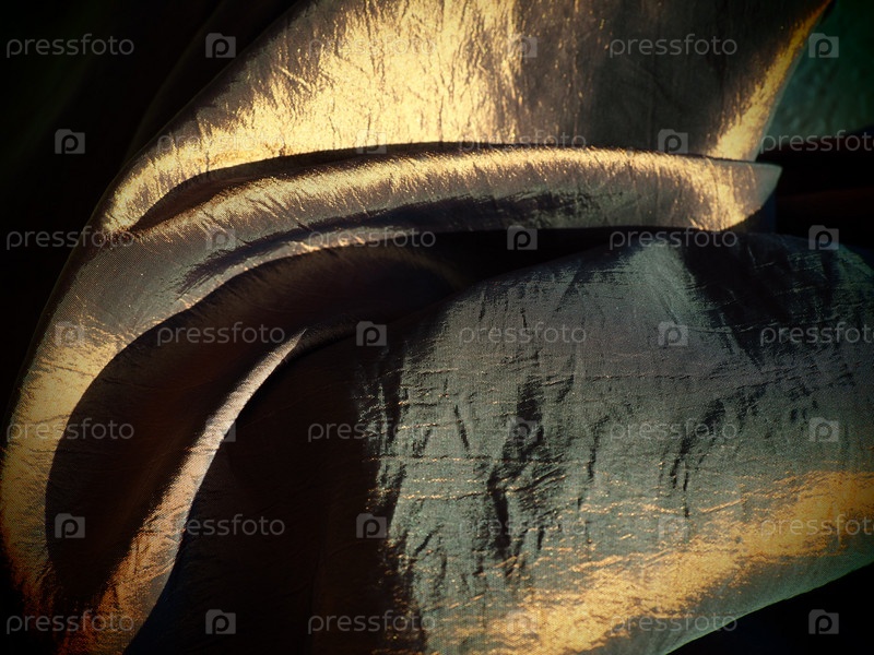 Красивая ткань - тафта, аккуратно сложенная волнами. Мятый материал, похожий на шелк или парчу. Перелив и цветовой градиент при разных углах освещения. Ткань для пошива одежды и штор