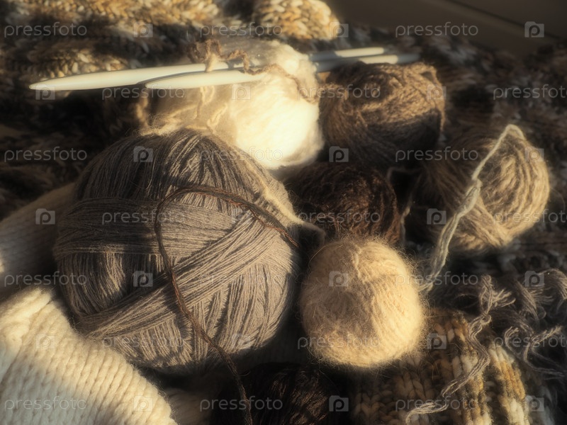 Клубки пряжи, вязаная одежда, спицы и крючки. Вязание как хобби. Коричневые, бежевые и белые нитки в мотках. Расфокусированное изображение