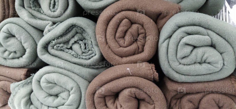 Мягкие пушистые серо-коричневые коврики, сложенные в мотки, рулоны и жгуты. Ассортимент покрывал на полке магазина. Одеяла красиво разложены для продажи. Теплая ворсистая синтетическая ткань
