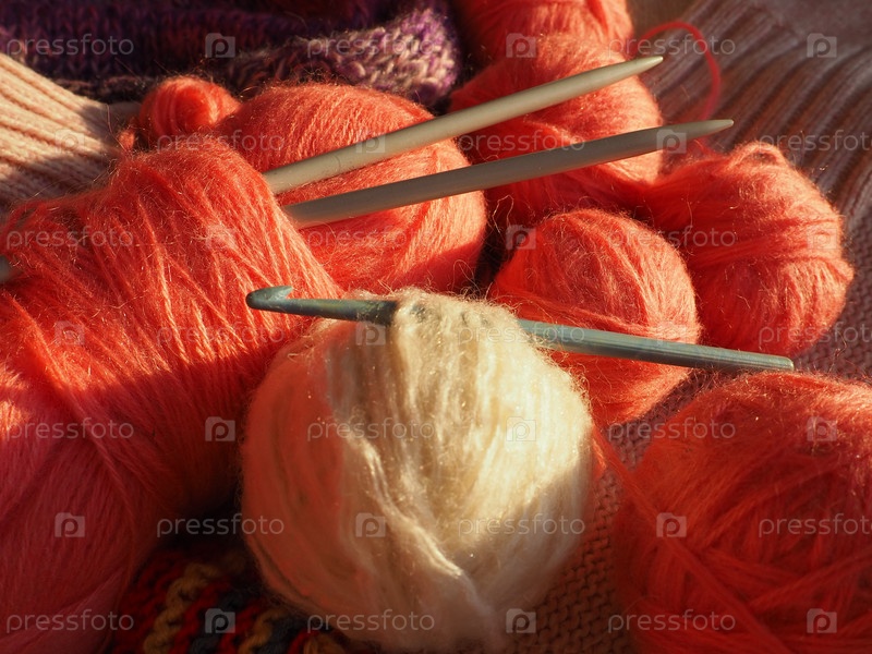 Запутывается, рычит. Клубки пряжи и ниток, вязаная одежда, спицы и крючки. Розовые, фиолетовые, красные и белые нитки в мотках. Расфокусированное изображение. Вязание и плетение как хобби