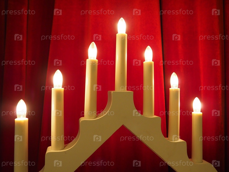 Арочный светильник Швиббоген в форме треугольного подсвечника. Красный фон. Вечерняя, романтическая, праздничная, религиозная или мистическая атмосфера. Горящие лампочки, напоминающие свет свечей
