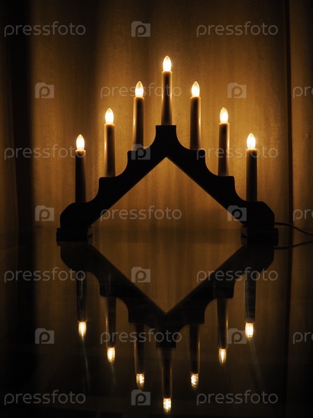 Арочный светильник Швиббоген, треугольный подсвечник на стеклянном столе. Желтый фон. Вечерняя, романтическая, праздничная, религиозная или мистическая атмосфера. Горящие лампочки, напоминающие свечи