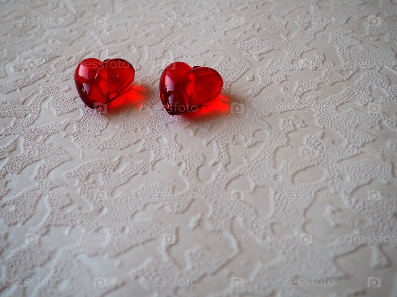 Валентинские сердечки. Красные пластиковые прозрачные сердечки. Поздравительная открытка с белым фоном к празднику Дня святого Валентина. Выражение любви. Копирование пространства. Плоская планировка. Белый волнистый фон
