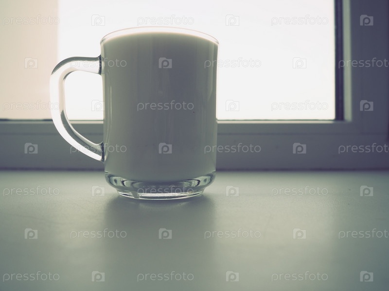 Стеклянная чашка с молоком на белом фоне. На заднем плане — оконная рама. Диетическое белковое питание