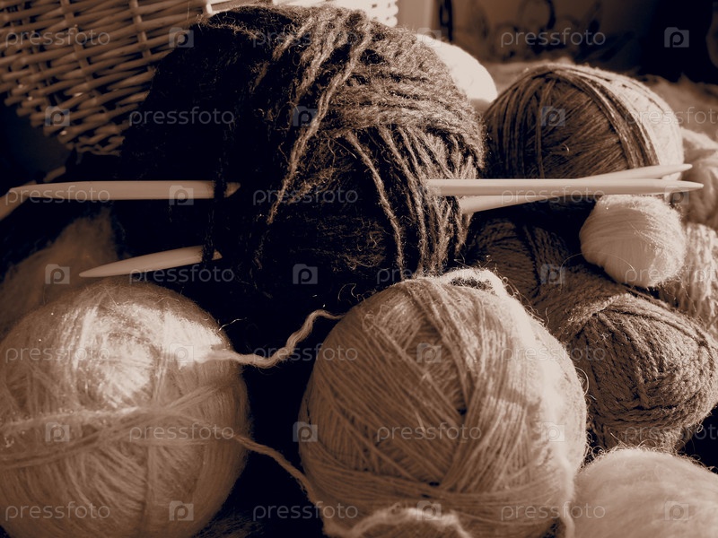 Клубки и мотки пряжи, трикотажная одежда, спицы и крючки. Вязание как хобби. Коричневые, бежевые и белые нитки в мотках. Монохромное изображение сепии