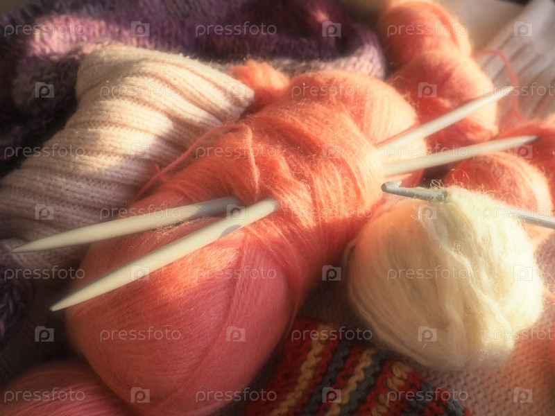 Запутывается, рычит. Клубки пряжи и ниток, вязаная одежда, спицы и крючки. Розовые, фиолетовые, красные и белые нитки в мотках. Расфокусированное изображение. Вязание и плетение как хобби