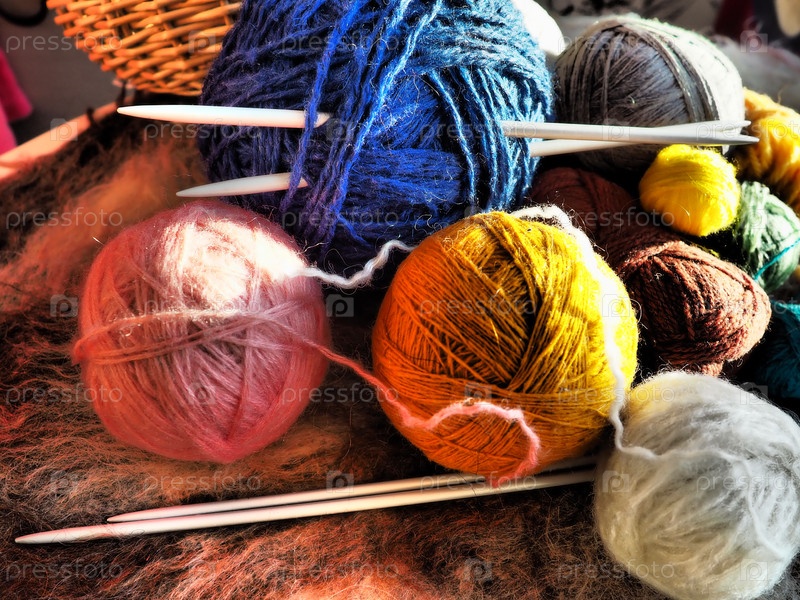 Вяжем шарф или свитер из серой, синей, белой и оранжевой пряжи. Мотки шерстяных и акриловых ниток. Вязание как хобби. Фурнитура, спицы, крючки