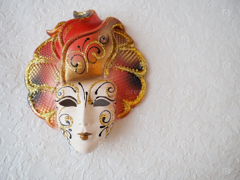 Карнавальные маски на белом фоне. Элемент костюма карнавального фестиваля. Пастельная, нежная и туманная атмосфера. Итальянские и венецианские традиции