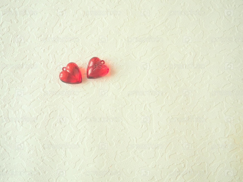 Валентинские сердечки. Красные пластиковые прозрачные сердечки. Поздравительная открытка с белым фоном к празднику Дня святого Валентина. Выражение любви. Копирование пространства. Плоская планировка. Белый волнистый фон