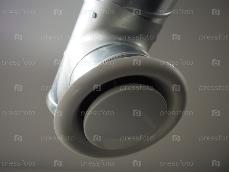 Вытяжка в общественном туалете. Круглая металлическая труба с серым воздухозаборником. Инженерные системы вентиляции. Оцинкованные трубы под потолком помещения. Пластиковый круглый наконечник