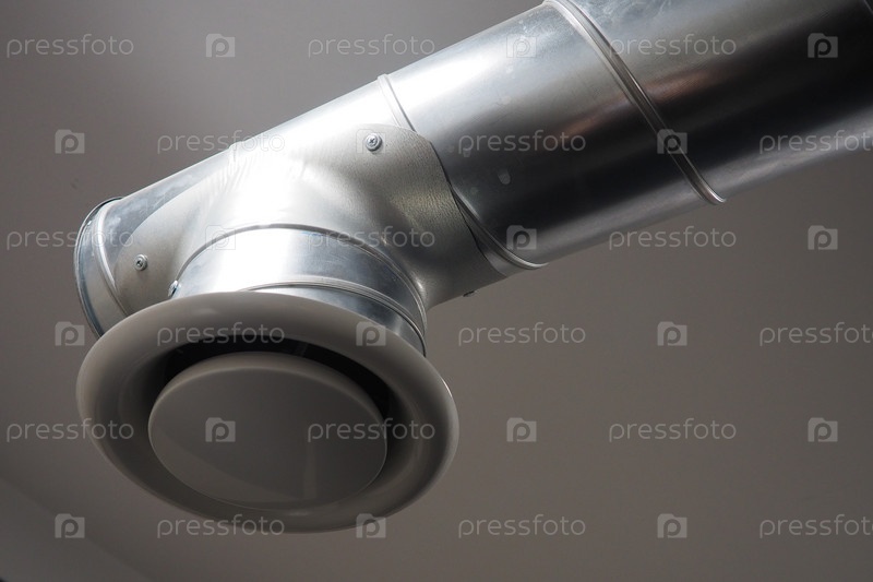 Вытяжка в общественном туалете. Круглая металлическая труба с серым воздухозаборником. Инженерные системы вентиляции. Оцинкованные трубы под потолком помещения. Пластиковый круглый наконечник