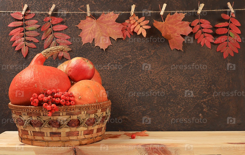 Творческая осенняя композиция с кленовыми листьями, тыквами, яблоками, ягодами рябины и пустым деревянным столом для демонстрации продукта, минимальная осенняя концепция, экранный баннер. С Днем Благодарения и поздравительной открыткой, выборочный фокус