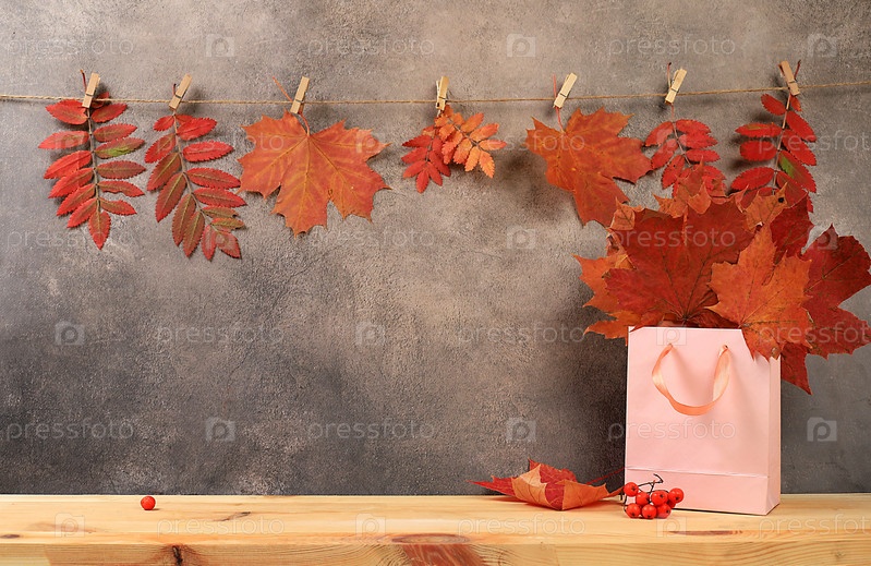Творческая осенняя композиция с кленовыми листьями и пустым деревянным столом для демонстрации продукта, минимальная осенняя концепция, баннер на экране. С Днем Благодарения и поздравительной открыткой, выборочный фокус