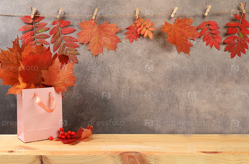 Творческая осенняя композиция с кленовыми листьями и пустым деревянным столом для демонстрации продукта, минимальная осенняя концепция, баннер на экране. С Днем Благодарения и поздравительной открыткой, выборочный фокус