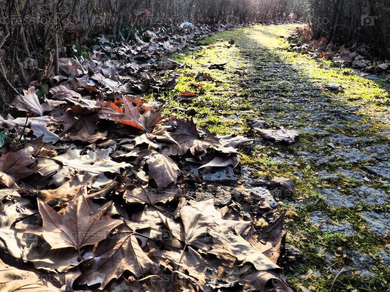 Осенняя тропа в городском парке. Сухие кленовые листья и низкие солнечные лучи. Красивый пейзаж. Поздняя осень или бесснежная зима. Брусчатка с мхом и лишайниками на дороге. Английский парк