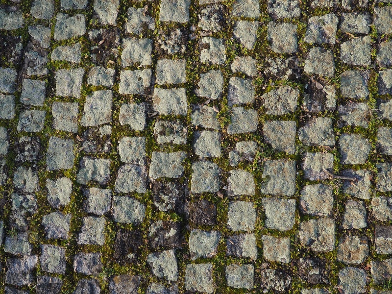 Аккуратно выложенная старая брусчатка. Тротуар на площади старого города. Квадратные и прямоугольные камни на земле, покрытые мхом и лишайниками