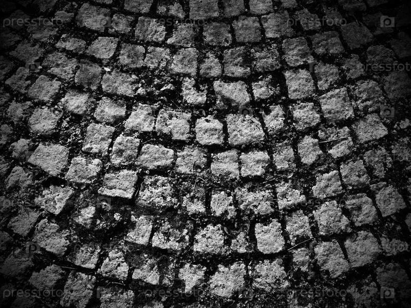Аккуратно выложенная старая брусчатка. Тротуар на площади старого города. Квадратные и прямоугольные камни на земле, покрытые мхом и лишайниками
