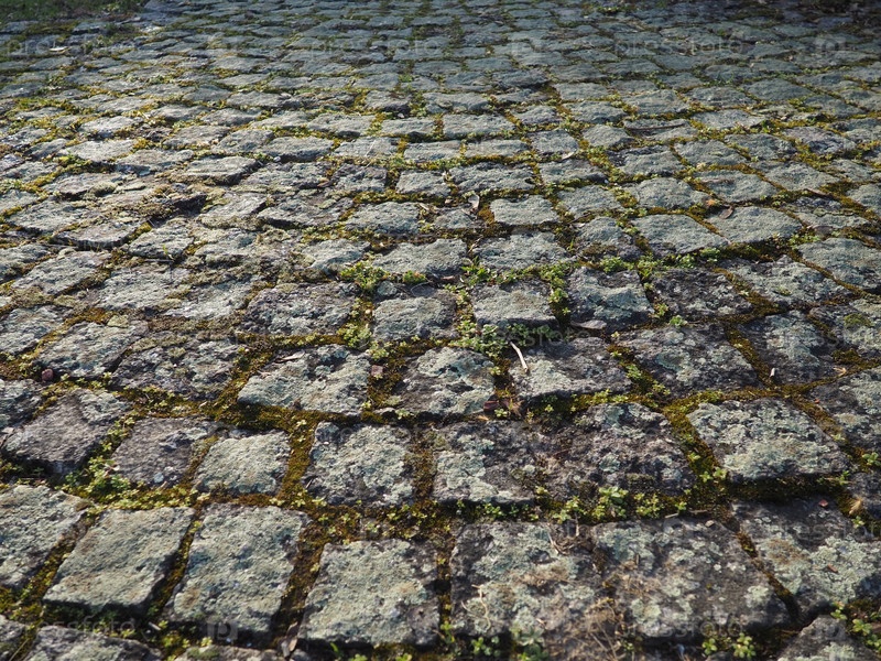 Аккуратно выложенная старая брусчатка. Тротуар на площади старого города. Квадратные и прямоугольные камни на земле, покрытые мхом и лишайниками