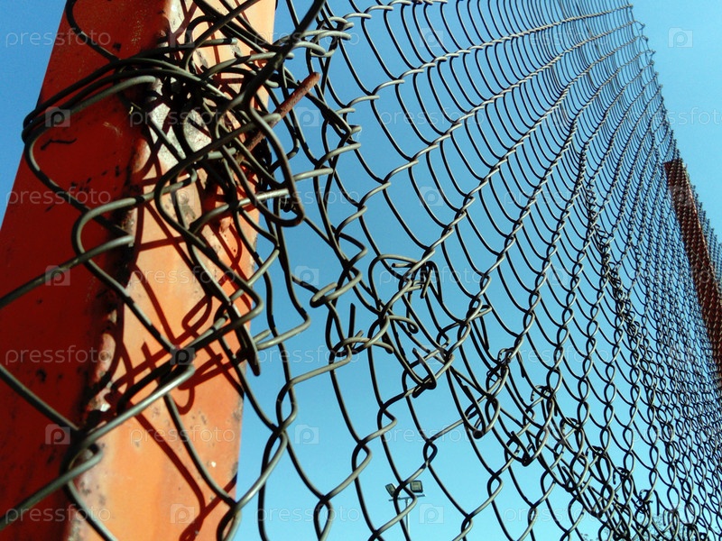 Металлическая сетка, прикрепленная к столбу. Часть забора на спортивной площадке. На заднем плане голубое небо. Изображение снизу. Крепление стального забора. Ржавчина и повреждения поверхности. Крупный план