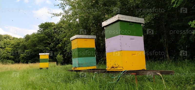 Ульи с пчелами. Пчеловодство. Ульи, стоящие в природе, окрашены в желтый, зеленый и синий цвета. Растения – медоносы. Пасека в Сербии. Пчелы собирают цветочный нектар и превращают его в мед