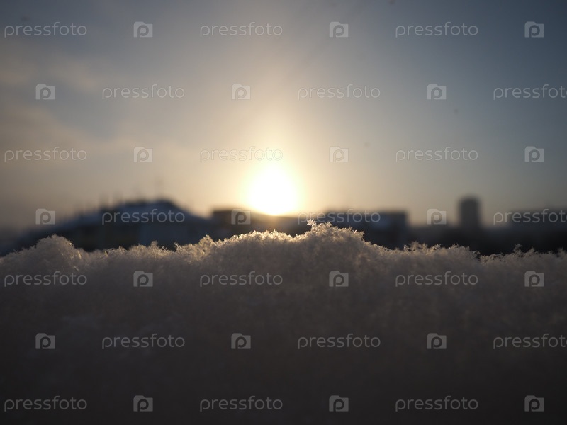 Закат зимой. Снег и снежинки. Горизонт города. Дома и крыши. Лучи низкого полярного солнца. Большая толщина снегопада. Зимний прогноз погоды. Северный пейзаж. Копировать пространство