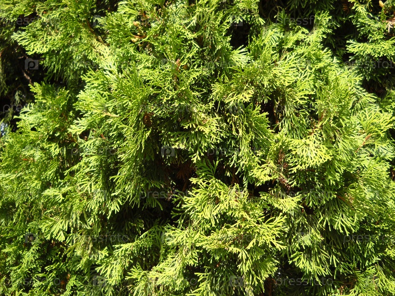 Зеленые ветки туи, залитые солнечными лучами. Тую используют для озеленения городов, для ландшафтного дизайна. Неприхотливое, морозостойкое, вечнозеленое растение