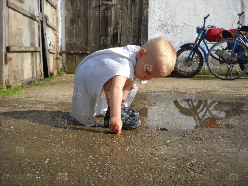 Деревенский мальчик играет в грязной луже рядом с сараем во дворе бабушки