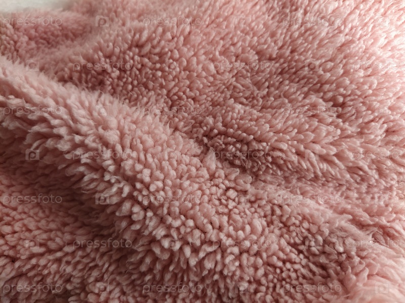 Розовый искусственный мех сложен волнами. Бледно-грязно-розовый цвет из синтетического материала. Мягкая текстура. Шерстяная куча скатана в комочки. Фрагмент покрывала